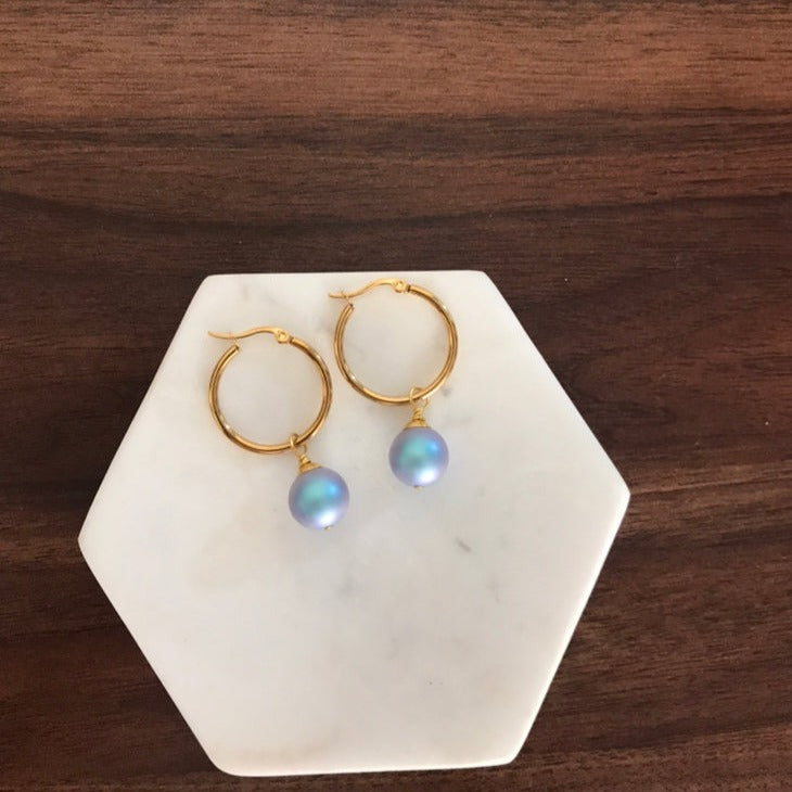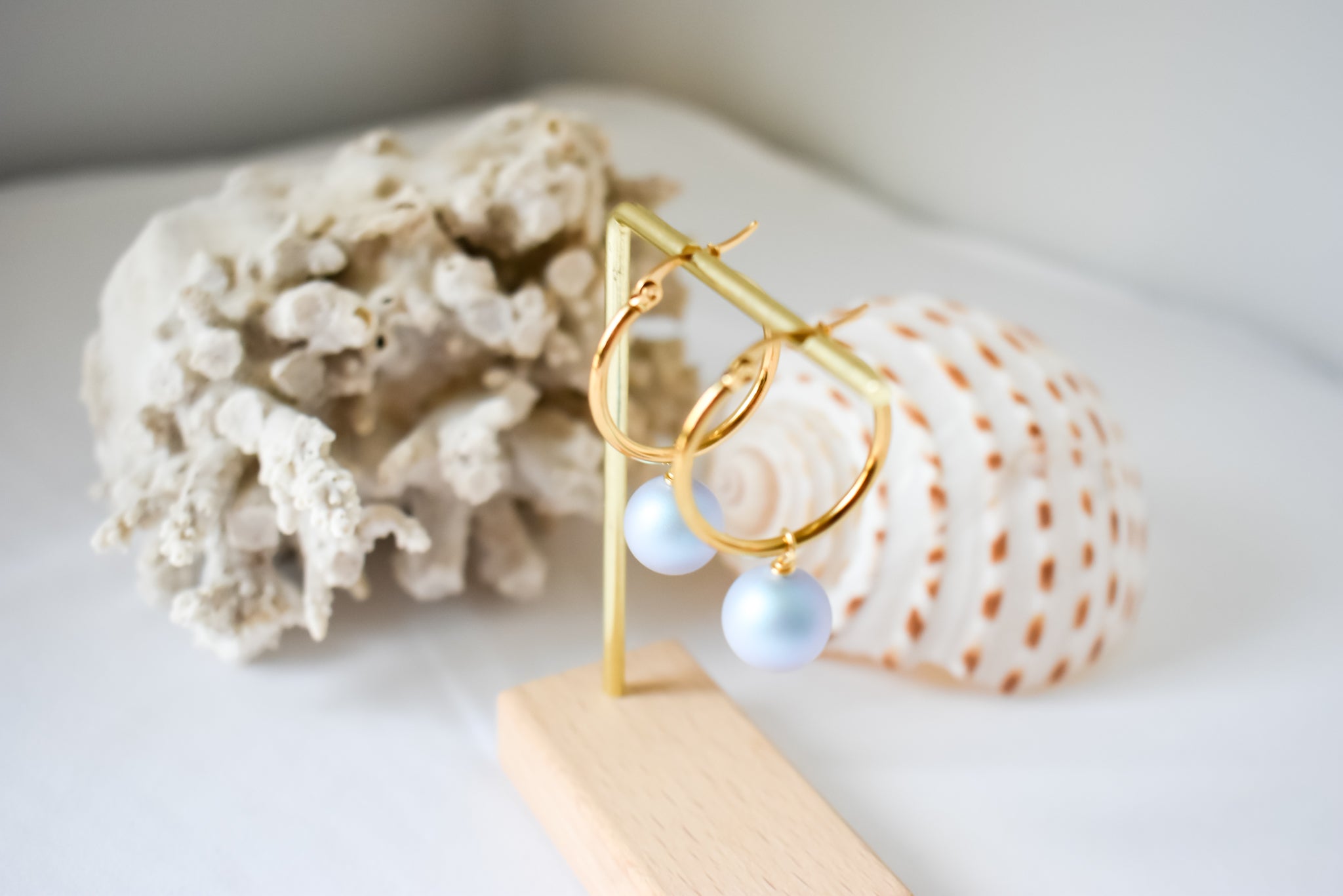 Our series of this Swarovski light blue pearl earrings continues with our high-quality 14k gold-plated hoop earrings and our Iridescent light blue round pearls. Each piece is specially handcrafted by our Penina Pearls team to create a beautiful piece just for you.