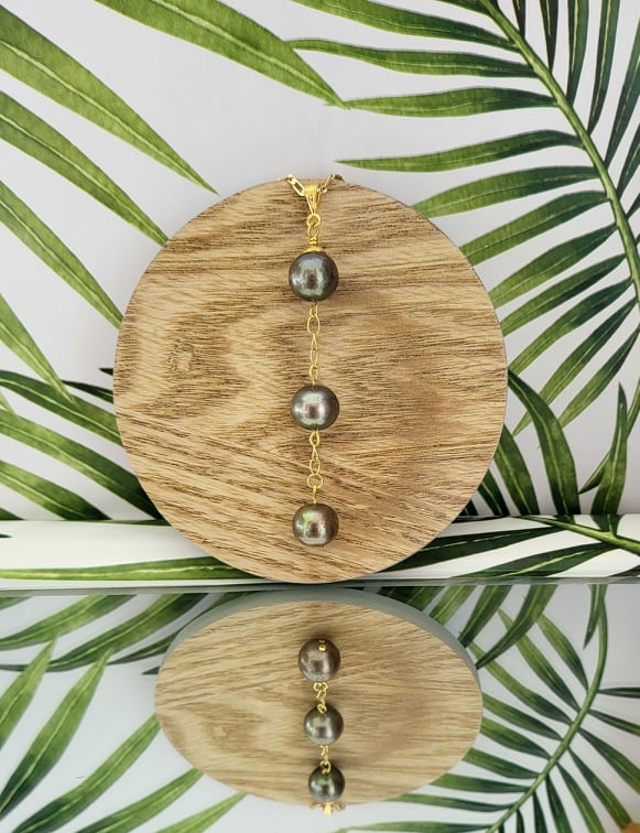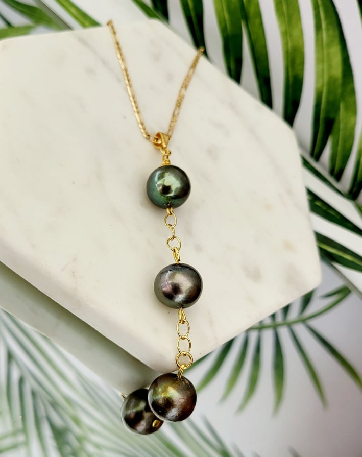 This necklace is featuring a one of a kind and unique premium natural Tahitian Tripple pearls pendant necklace. It comes with a solid 14k gold-filled Figaro chain. The stunning handcrafted piece is an excellent gift for her!