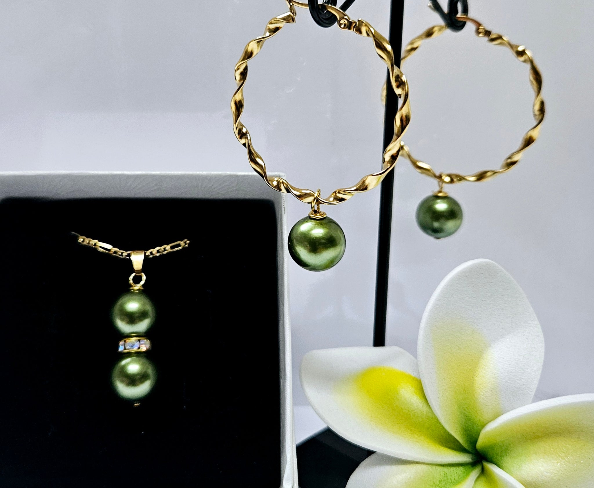 This lovely pearls set features a perfectly round green Swarovski pearls, that is worn with the Figaro-style gold chain and hoop earrings. It can be worn with any outfit, to any function and everyday.