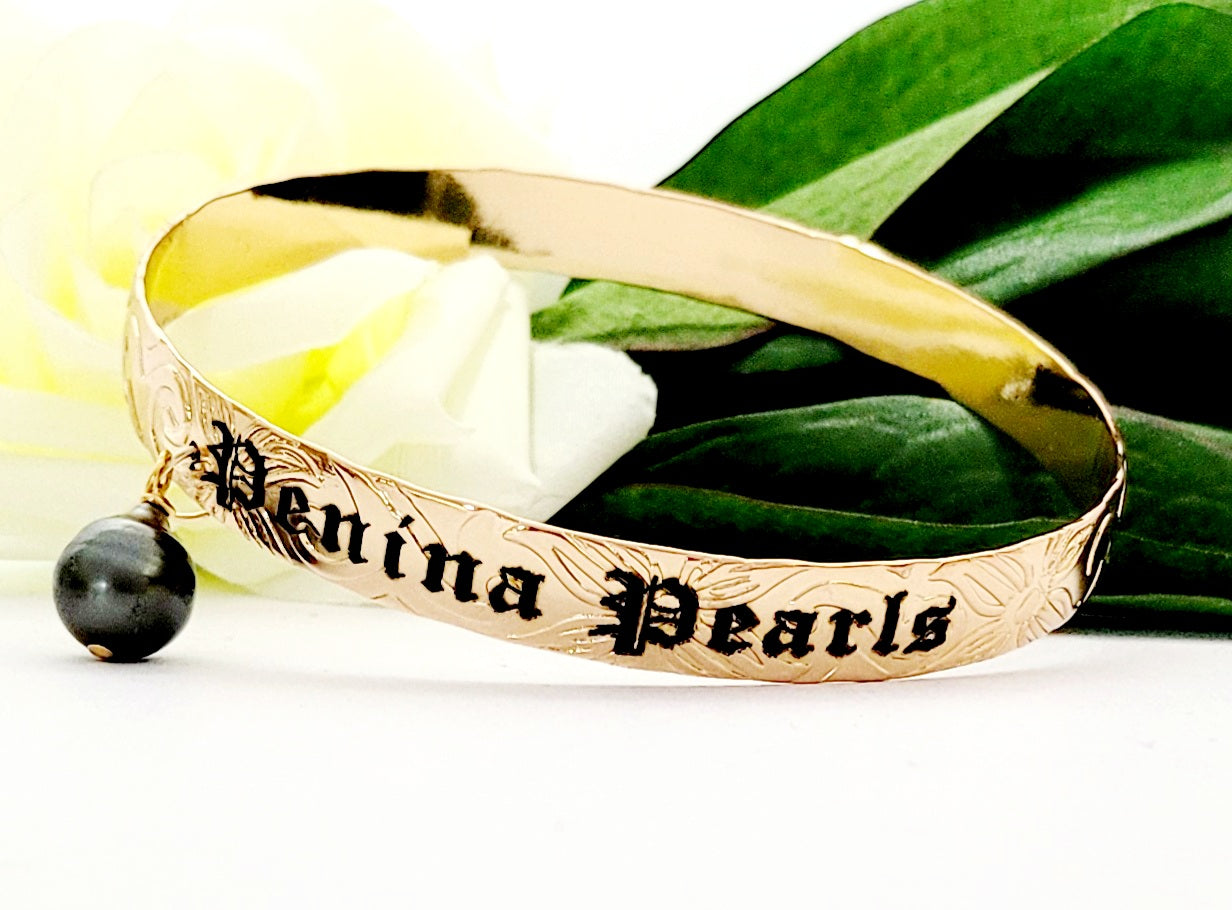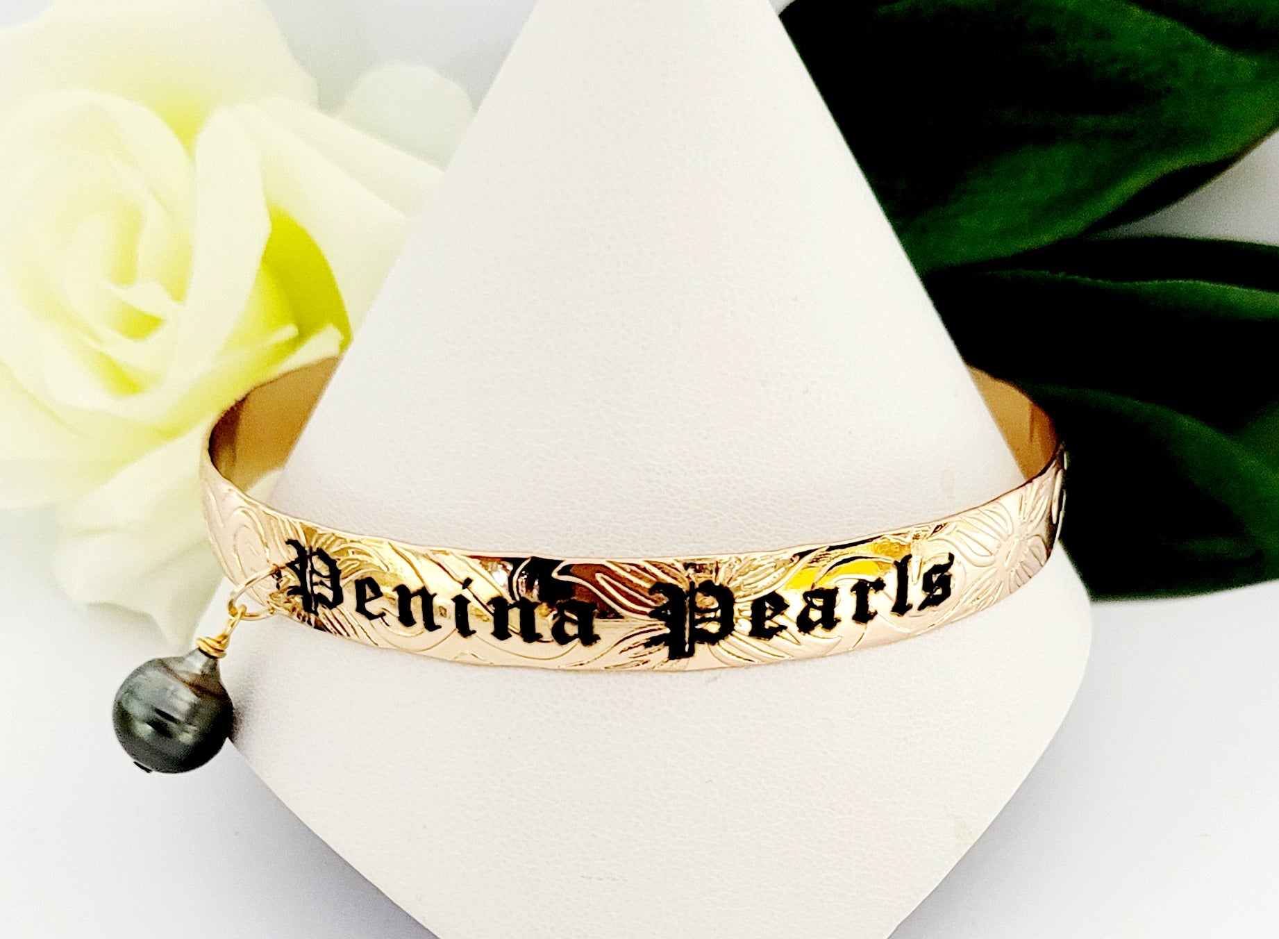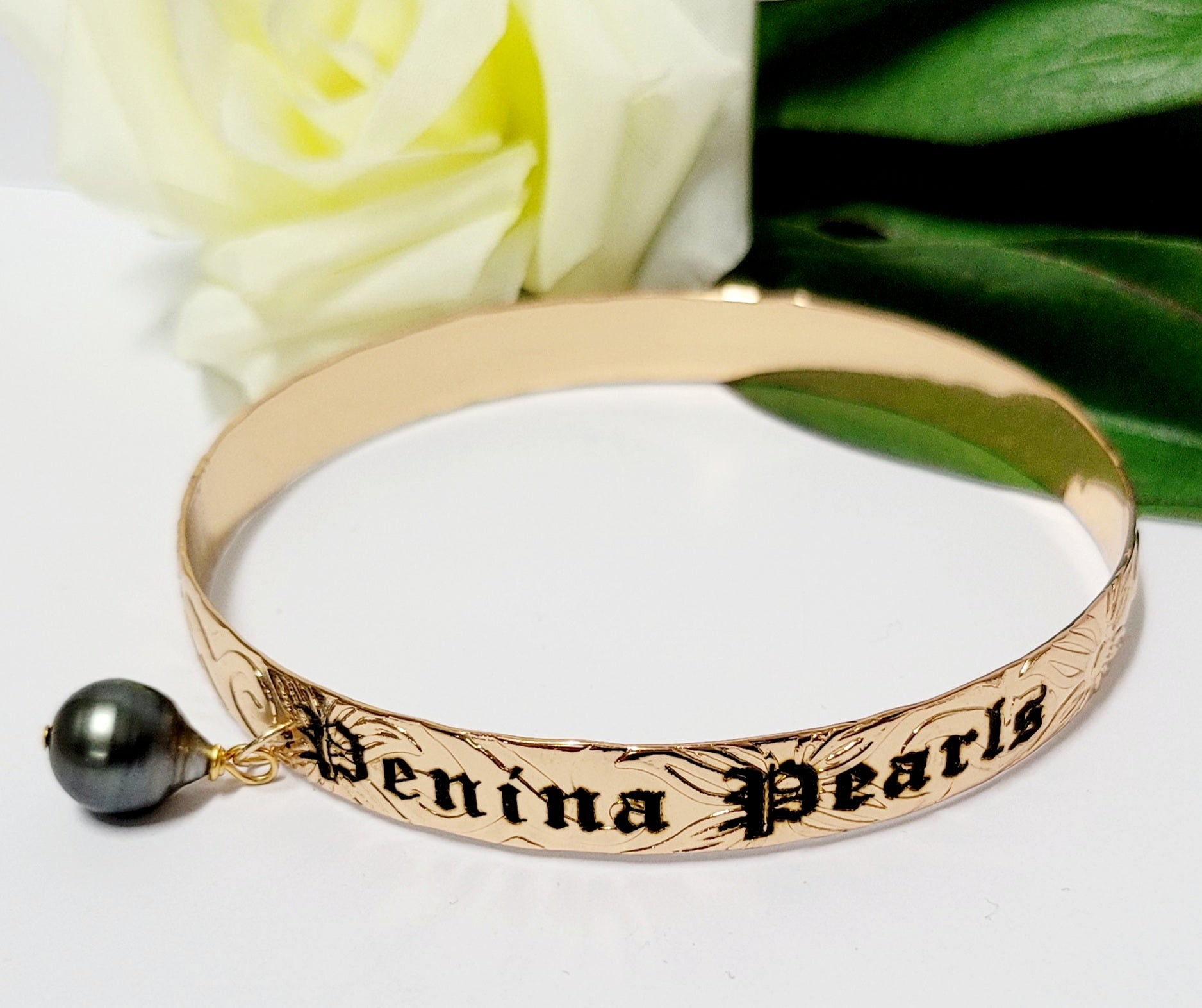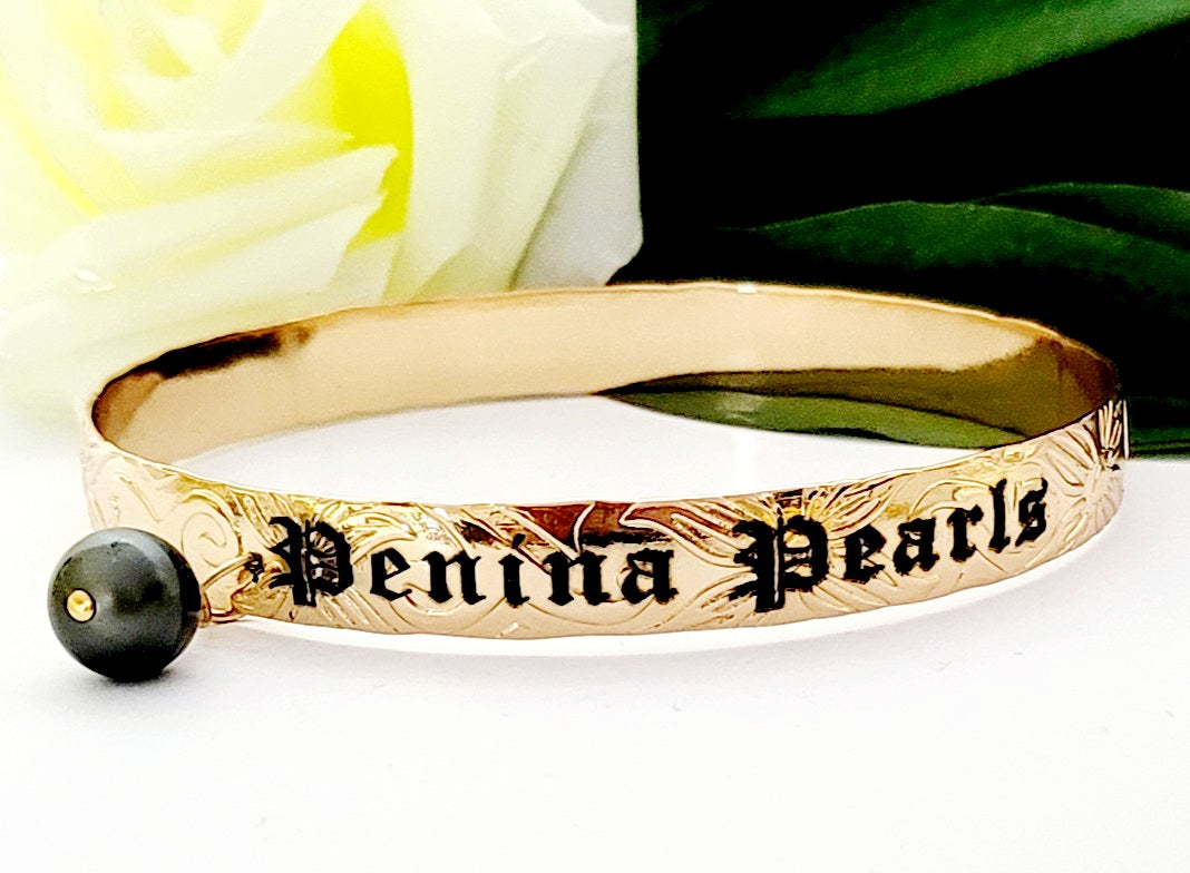 Penina Pearls are now featuring personalized engraved names on our gold-filled bangles with detailed floral engraving surrounding it, never forget the natural beauty on a genuine Tahitian Pearl embellished on it. It is perfect as an anniversary or other gift idea for that special someone in your life. This is closed bangle and therefore its slightly adjustable.
